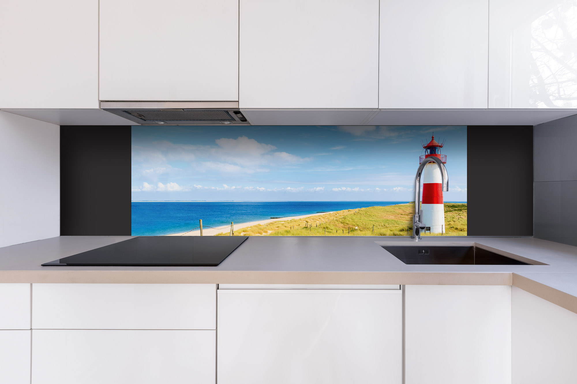 Placă decorativă dibond pentru bucătărie Far pe plajă - 180 x 60 cm