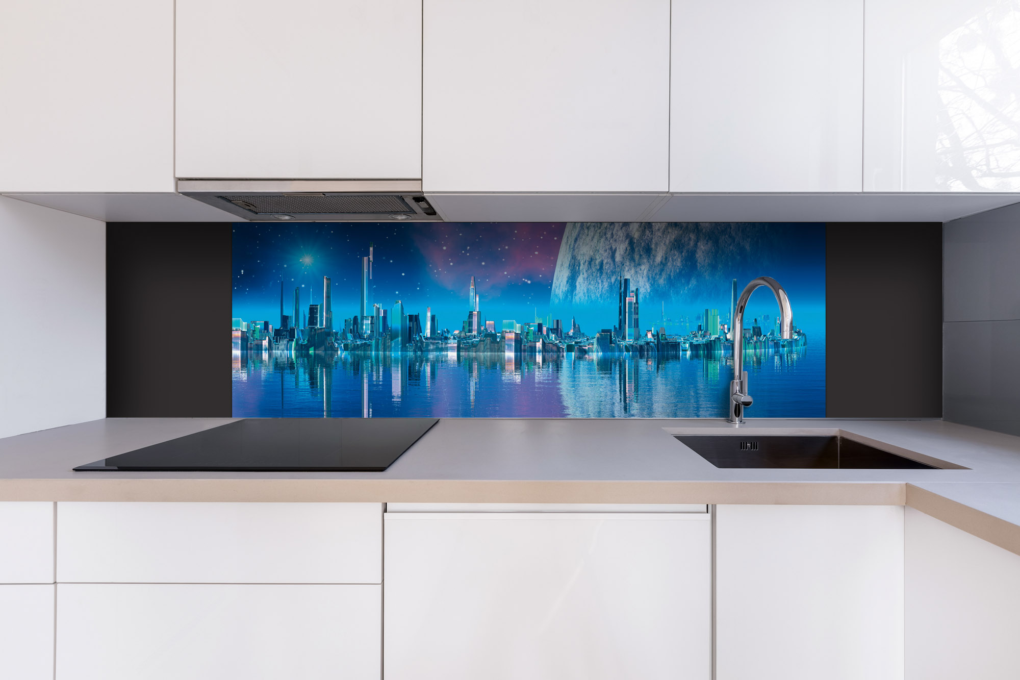 Placă decorativă dibond pentru bucătărie Orașul viitorului - 180 x 60 cm