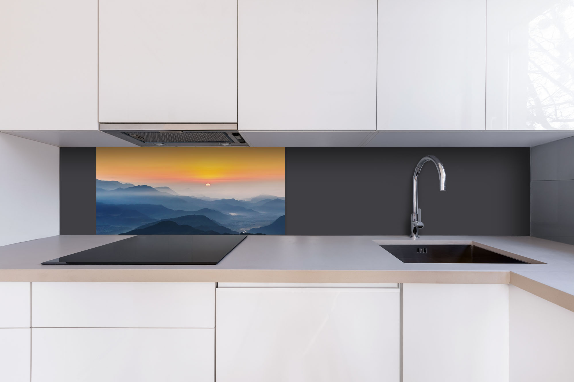 Placă decorativă dibond pentru bucătărie Răsărit de soare în Himalaya - 80 x 40 cm