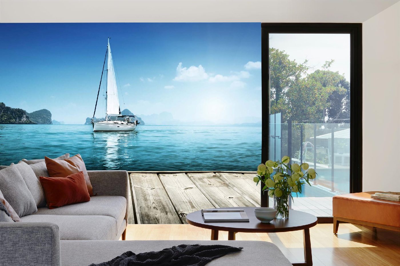 MS-5-2765 Fototapetă vlies pentru perete Iaht la digul de lemn - 375 x 250 cm