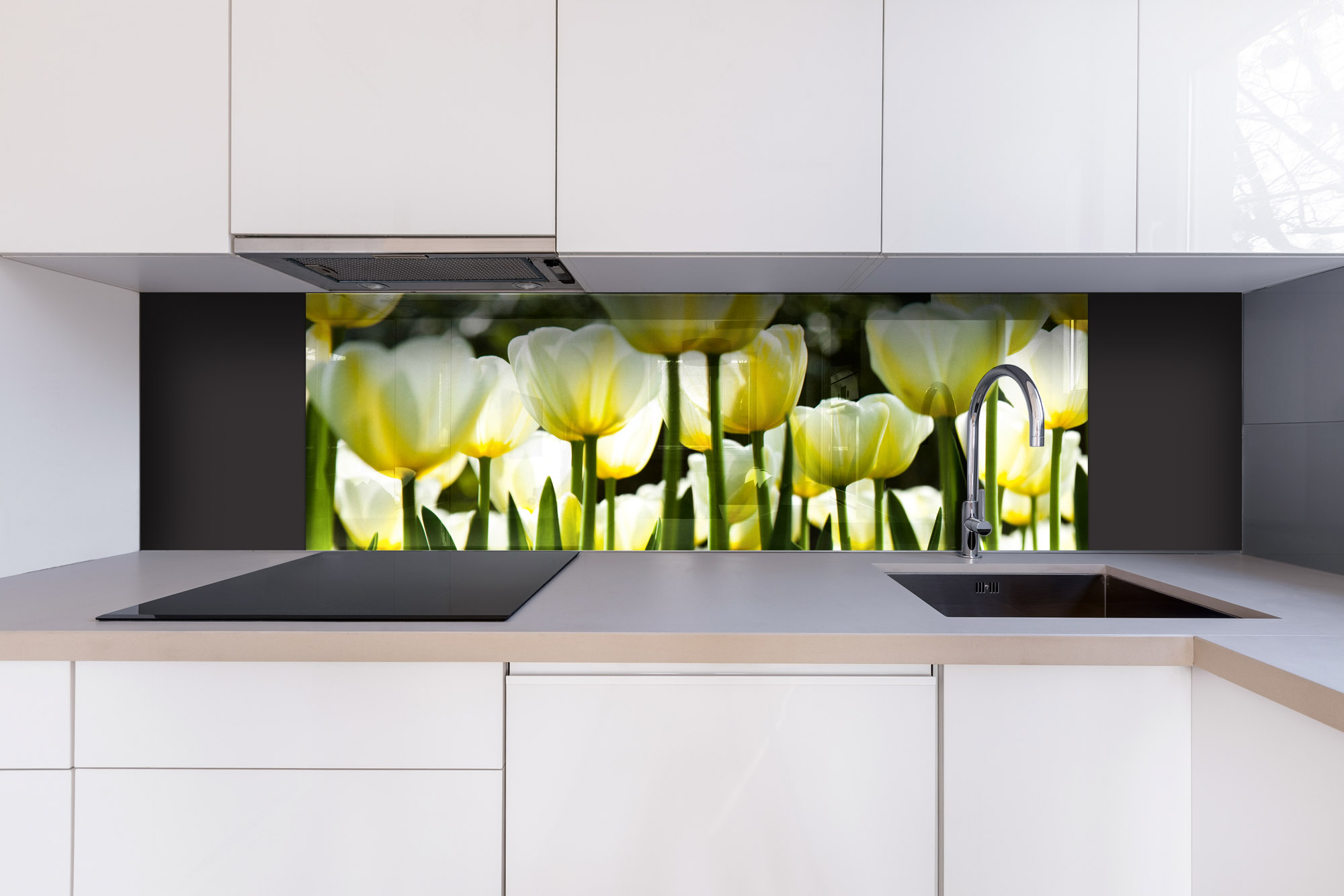 Plexiglas pentru peretele de bucătărie Lalele albe – 180 x 60 cm