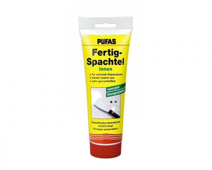 Pufas Fertigspachtel este potrivit în special pentru reparații, netezirea și chituitul suprafețelor neuniforme și rugoase, precum și pentru chituitul prefabricatelor din beton gata preparate, tencuielilor netede și structurate în interior. Chitul este deosebit de rezistent și potrivit pentru chituitul țesăturilor din fibră de sticlă. Este utilizabil pe toate suporturile minerale (tencuieli, beton, cărămizi etc.), acoperiri dispersive și plăci de gips-carton. Nu este potrivit pentru chituit lemn, fier, sticlă și materiale plastice.