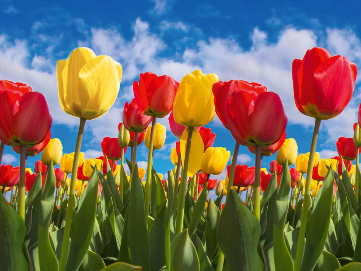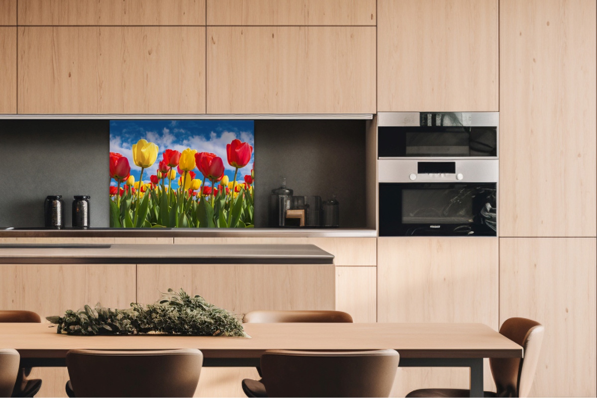 Placă decorativă dibond pentru bucătărie Câmp de lalele - 80 x 60 cm