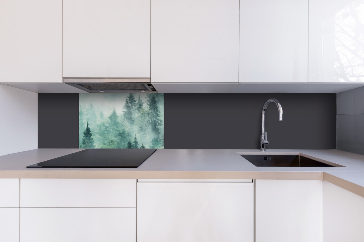 Placă decorativă dibond pentru bucătărie Ceață în pădure - 60 x 40 cm