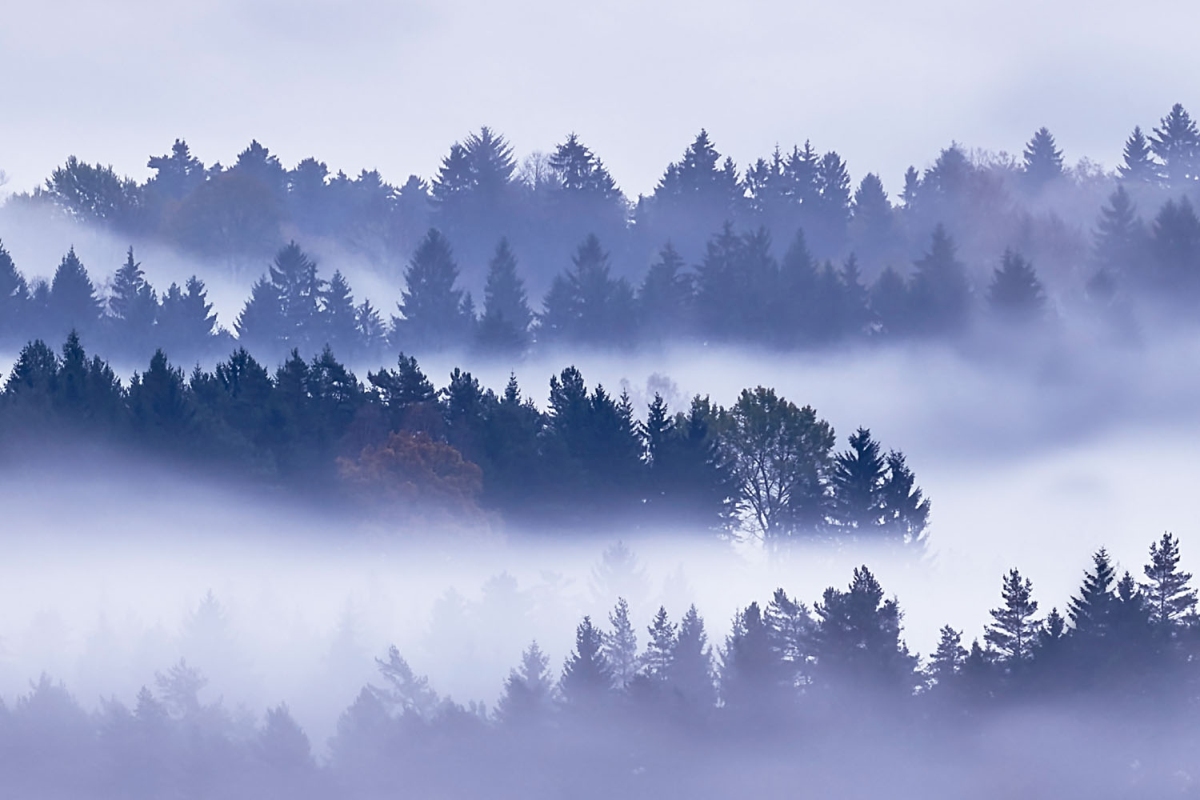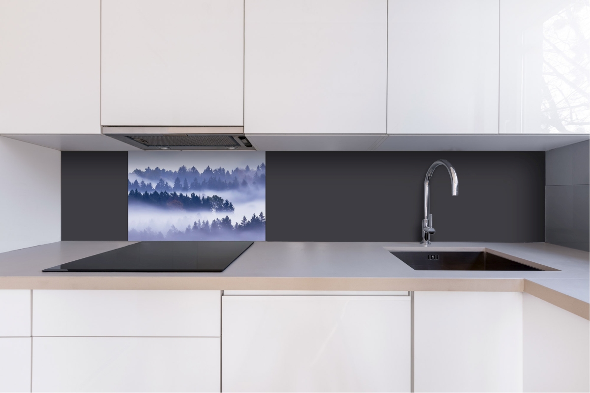 Placă decorativă dibond pentru bucătărie Ceață între copaci - 60 x 40 cm