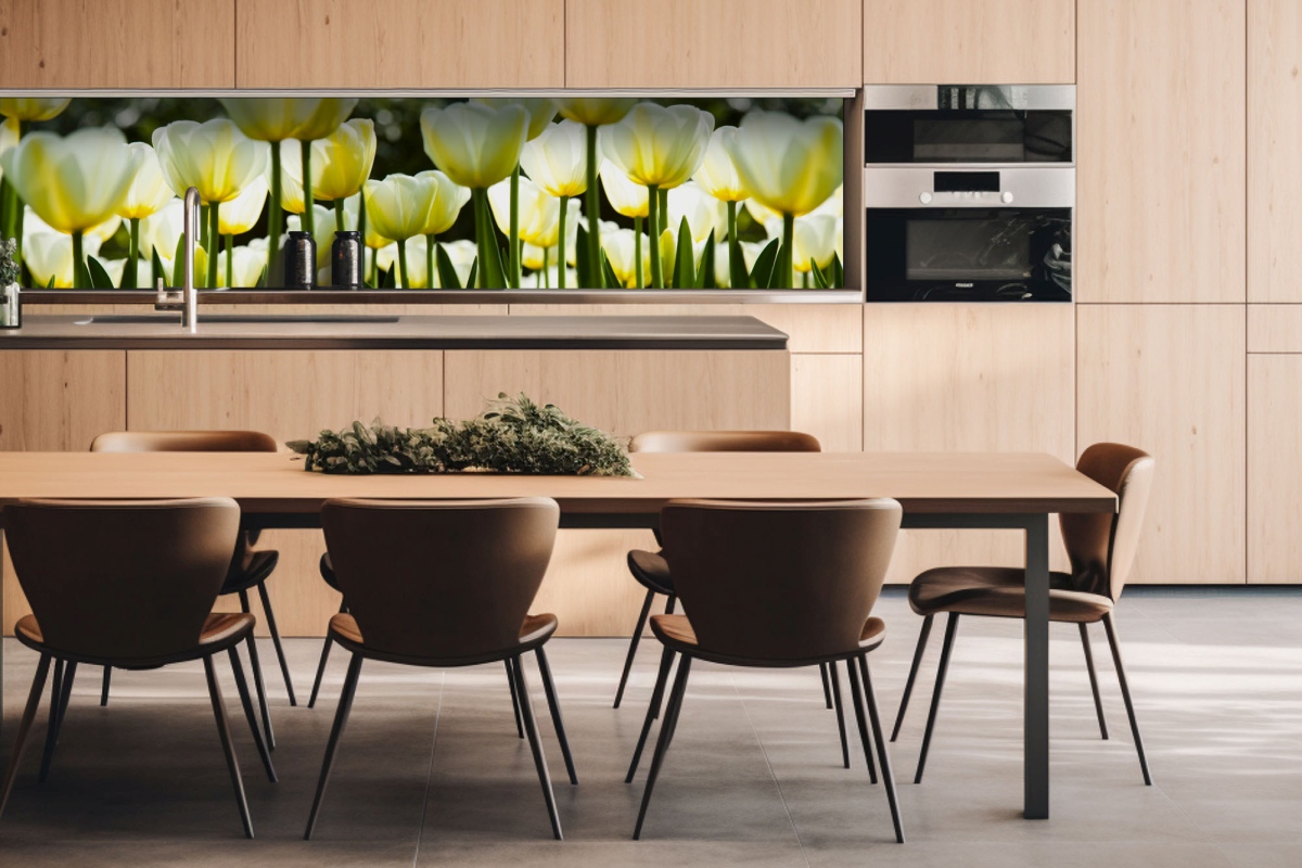 Placă decorativă dibond pentru bucătărie Lalele albe - 260 x 60 cm