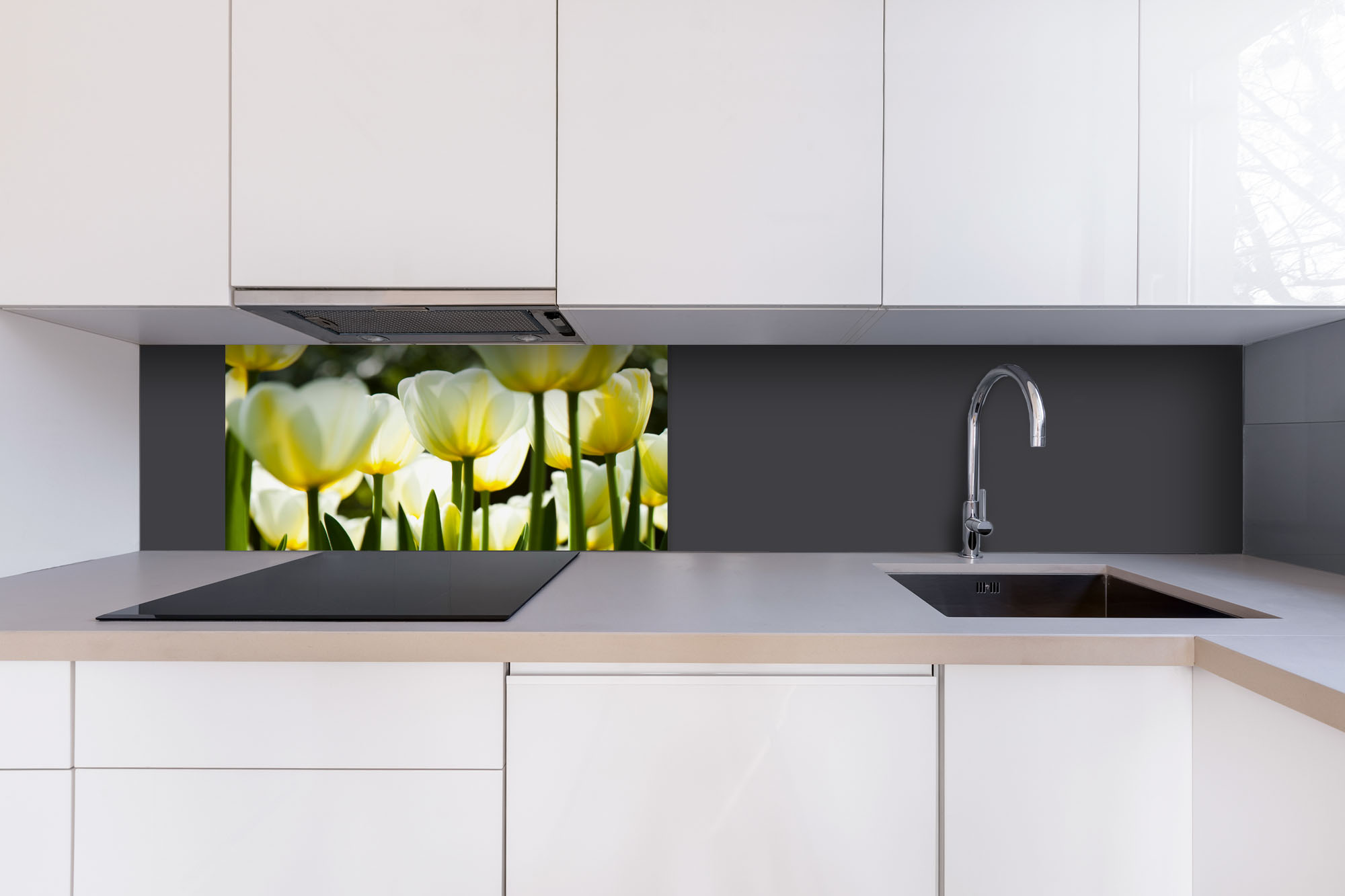 Placă decorativă dibond pentru bucătărie Lalele albe - 80 x 40 cm