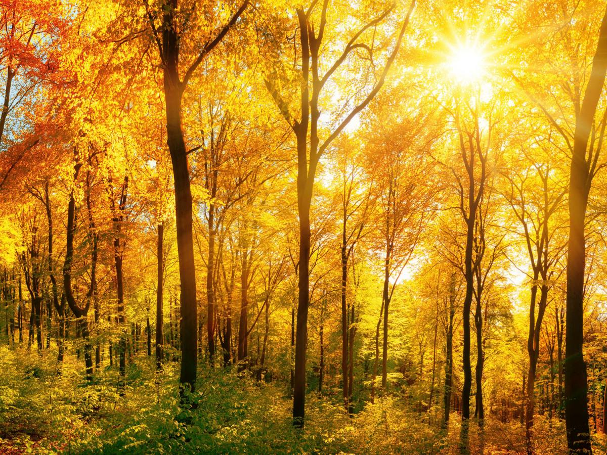 Placă decorativă dibond pentru bucătărie Pădure însorită - 80 x 60 cm