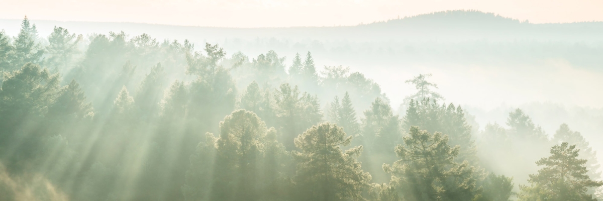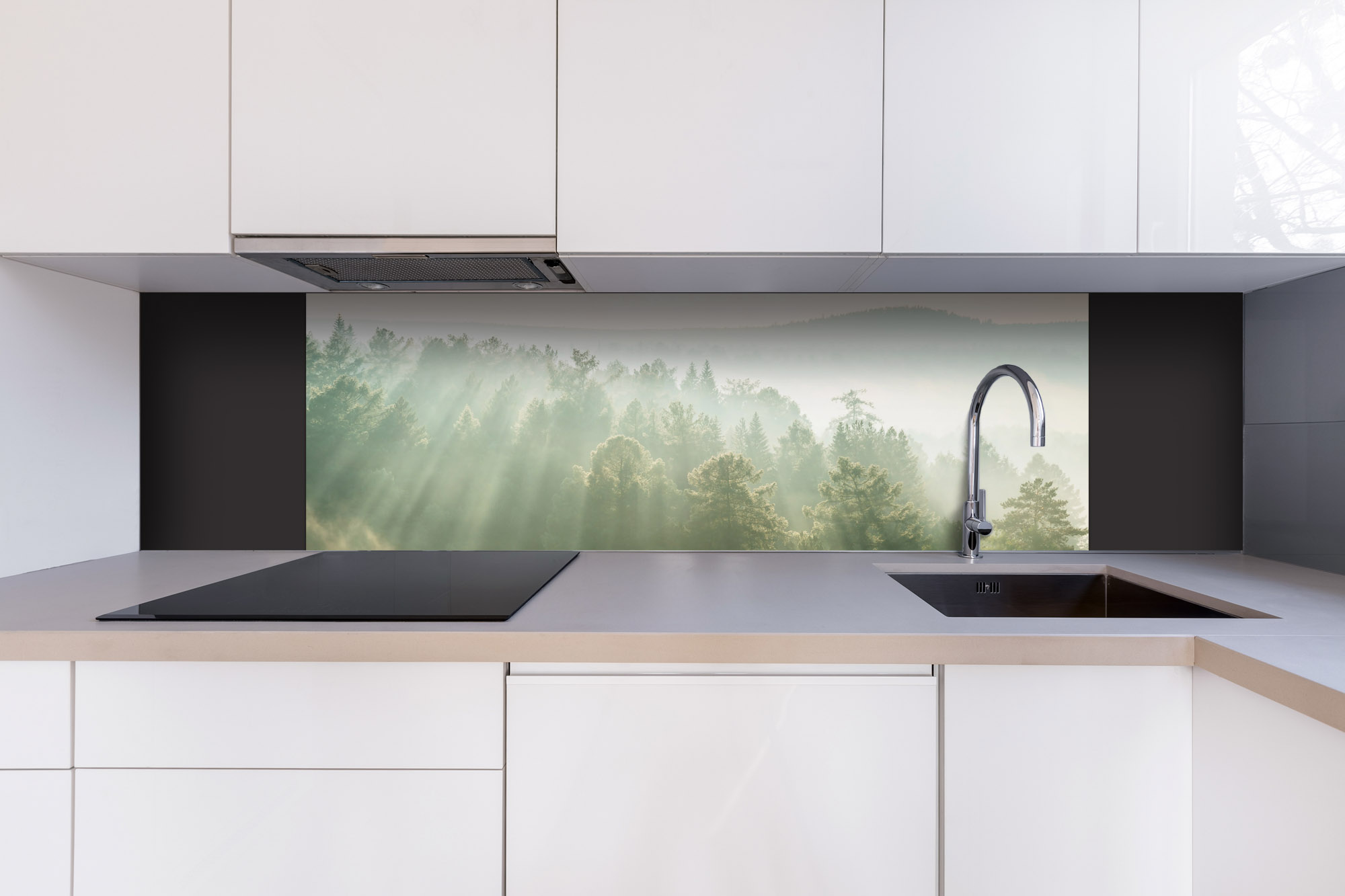 Placă decorativă dibond pentru bucătărie Raze de soare peste pădure - 180 x 60 cm
