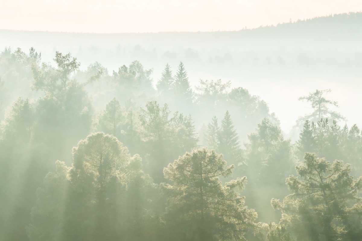 Placă decorativă dibond pentru bucătărie Raze de soare peste pădure - 60 x 40 cm
