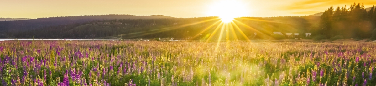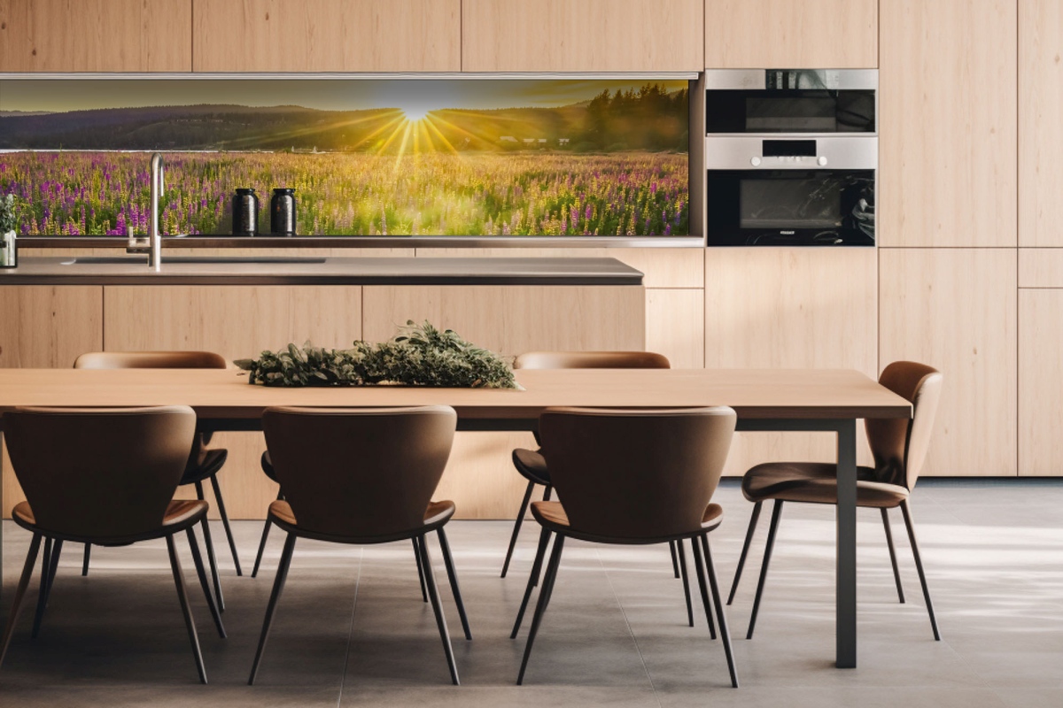 Placă decorativă dibond pentru bucătărie Raze de soare peste pajiște - 260 x 60 cm