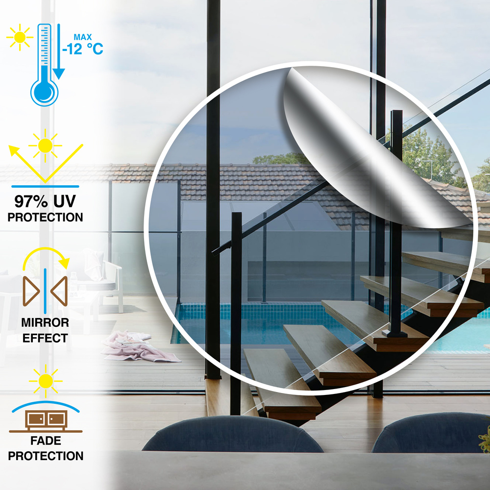 Căutați o soluție simplă și ieftină pentru a preveni ca locuința dumneavoastră să se transforme într-o seră supraîncălzită în zilele de vară? Folia solară reflectă majoritatea radiațiilor UV dăunătoare. Astfel, temperatura în încăpere scade și confortul crește în zilele călduroase. În același timp, vă oferă intimitate datorită efectului de oglindă semitransparentă.