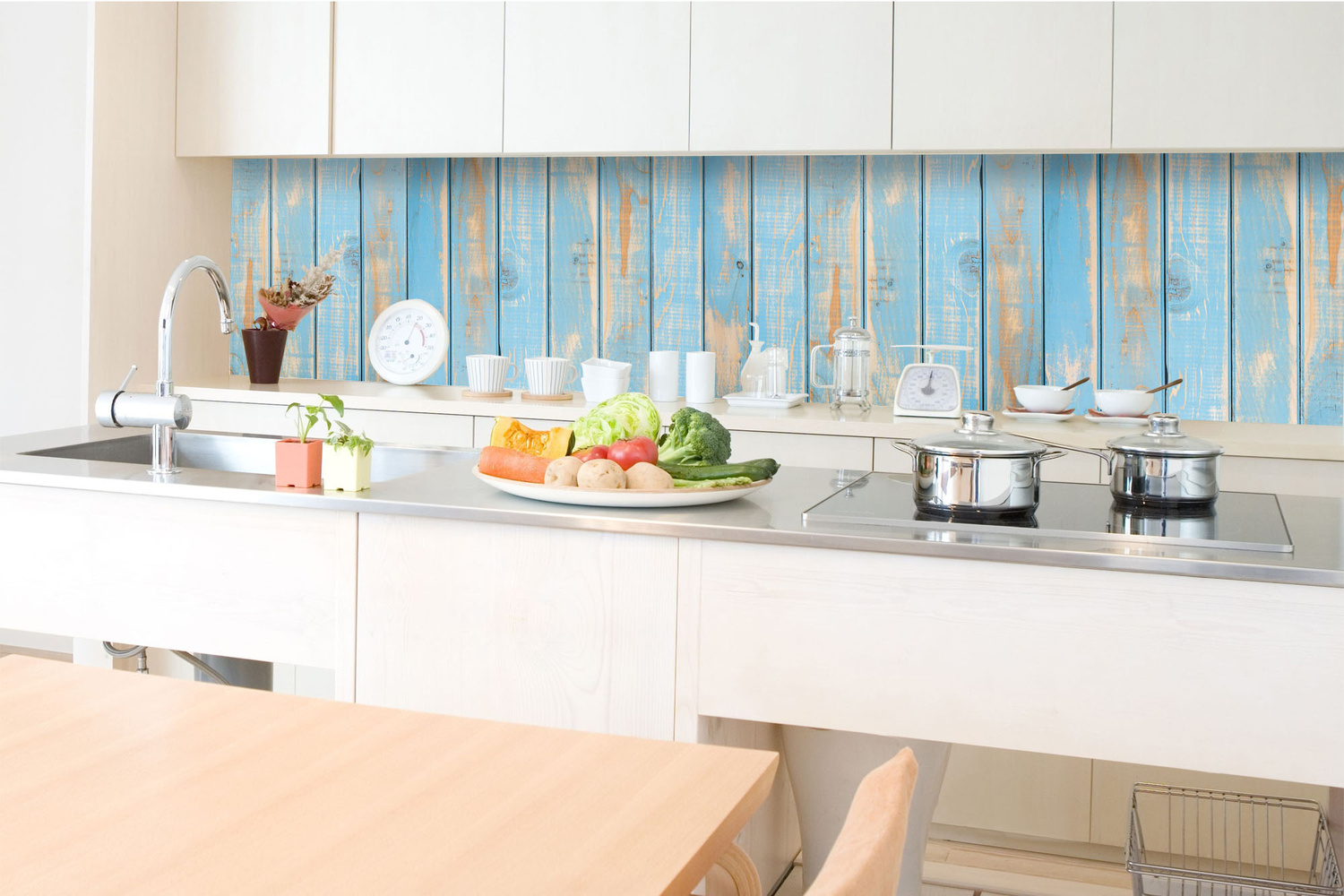 KI-350-290 Fototapet autoadeziv pentru bucătărie – Lamele vechi albastre 350 x 60 cm