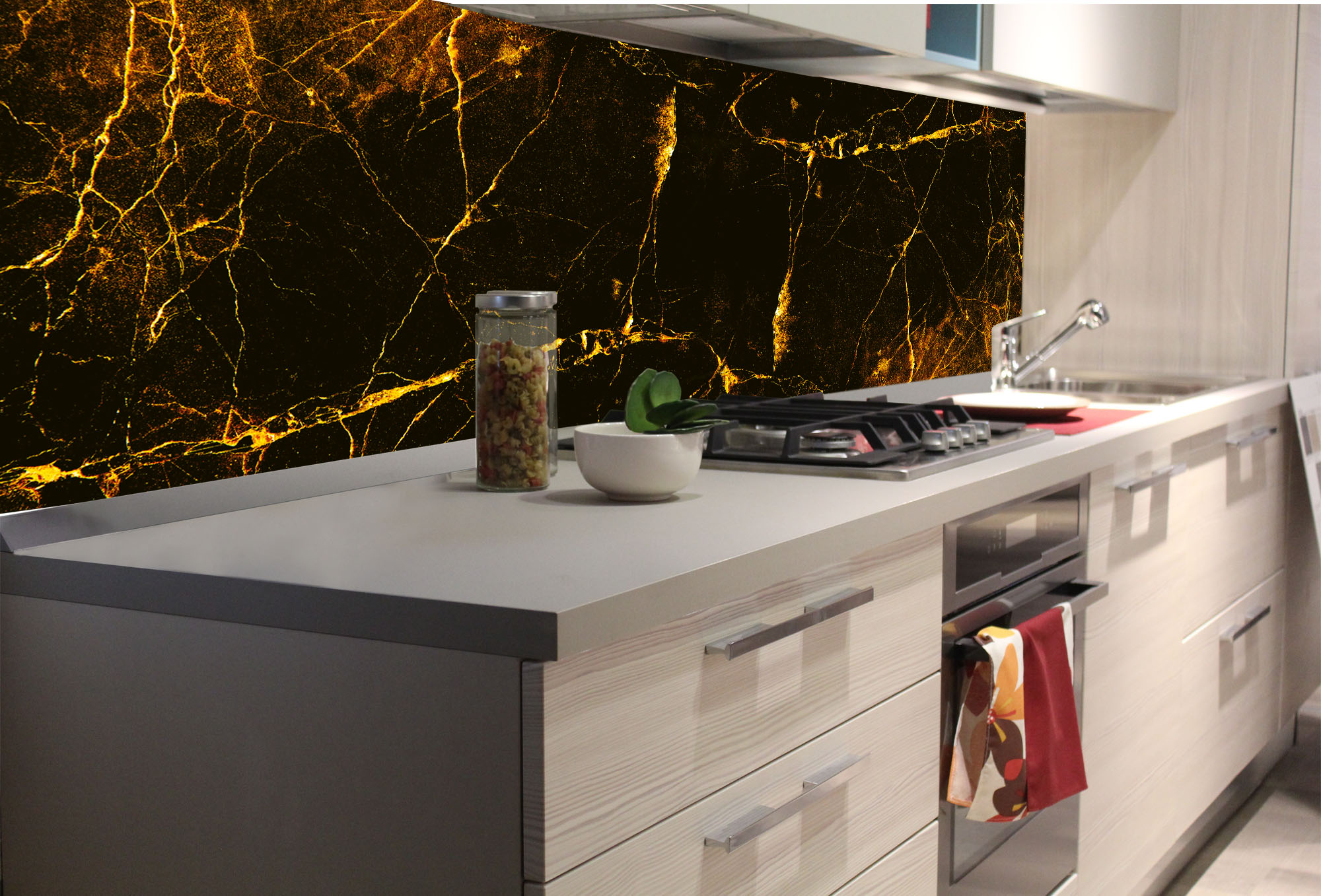 KI-180-279 Fototapet autoadeziv pentru bucătărie – Negru și marmură aurie 180 x 60 cm