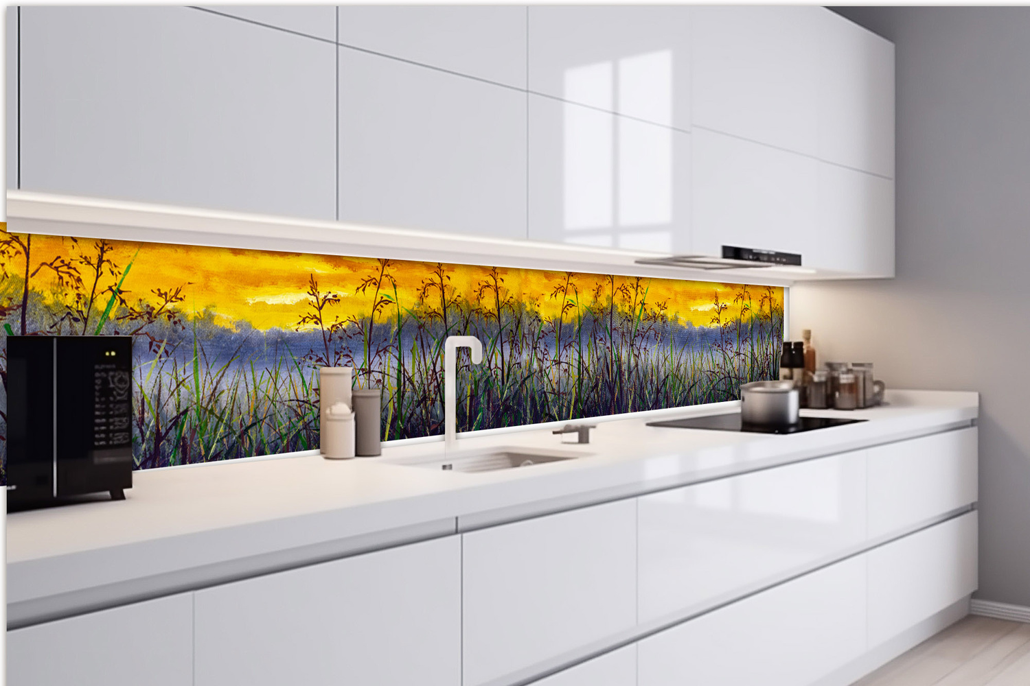 KI-420-210 Fototapet autoadeziv pentru bucătărie – Pictură din denim cu iarbă de pajiște 420 x 60 cm