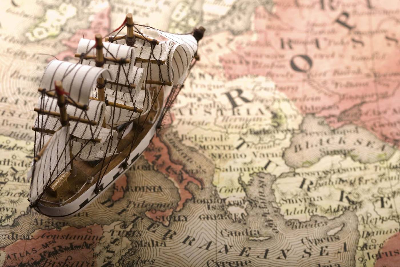Fototapetă din vlies autocolantă Machetă de navă pe hartă 375 x 250 cm