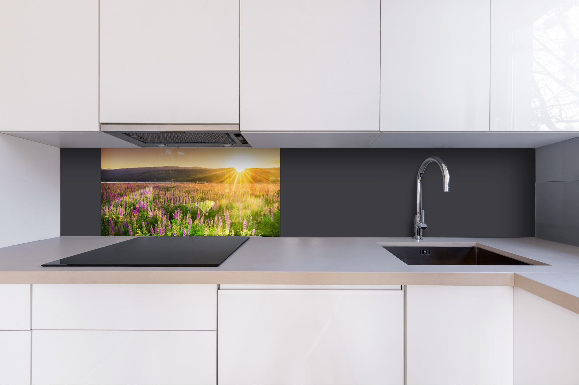 Plexiglas pentru peretele de bucătărie Apus de soare pe pajiște – 80 x 40 cm